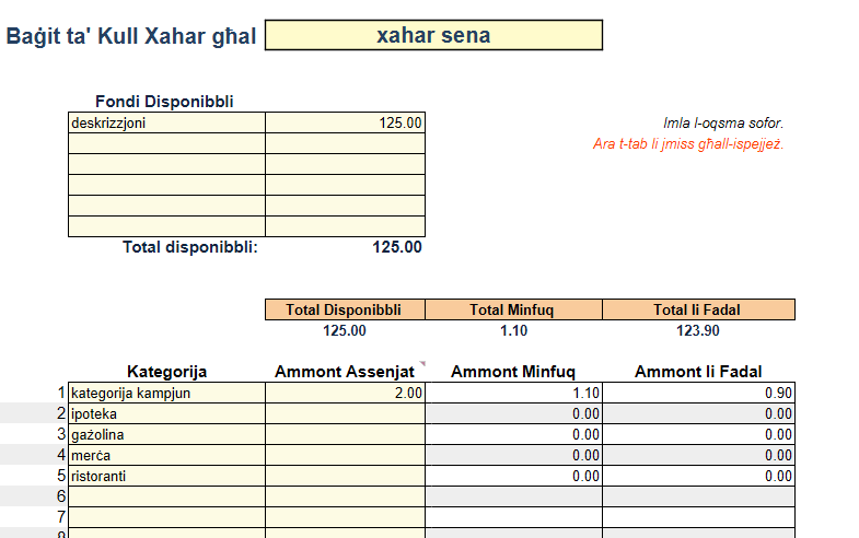 1. Fl-ewwel tab, iddetermina l-ammont ta' flus ta' kull xahar tiegħek u assenja xi flus għal kull kategorija. Oħloq il-kategoriji tiegħek stess.