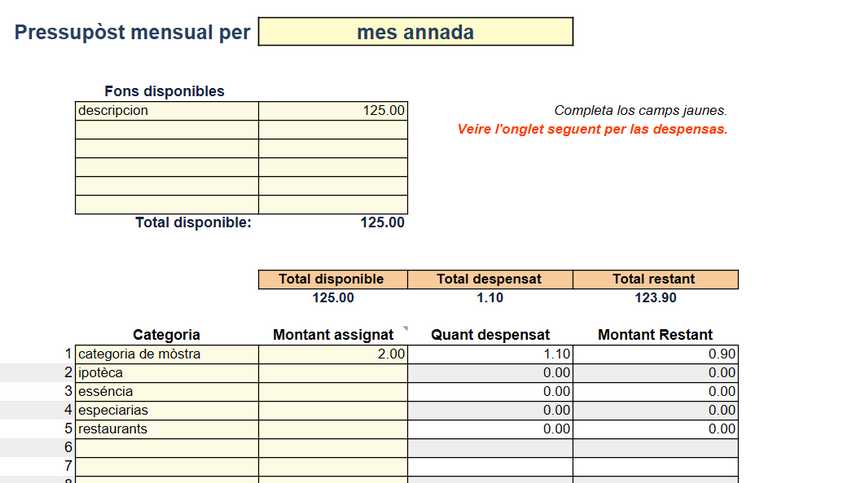 1. Sul primièr onglet, determinatz vòstre montant mensual d'argent e assignatz un pauc d'argent a cada categoria. Creatz vòstras pròprias categorias.