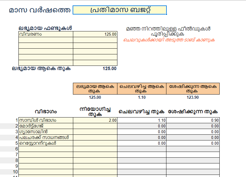 1. ആദ്യ ടാബിൽ, നിങ്ങളുടെ പ്രതിമാസ പണത്തിന്റെ തുക നിർണ്ണയിക്കുകയും ഓരോ വിഭാഗത്തിനും കുറച്ച് പണം നൽകുകയും ചെയ്യുക. നിങ്ങളുടെ സ്വന്തം വിഭാഗങ്ങൾ സൃഷ്ടിക്കുക.
